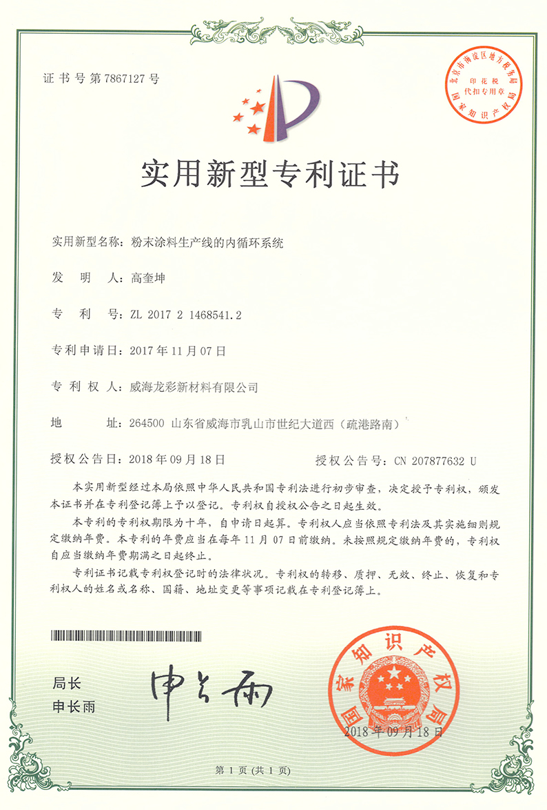 威海龍彩新材料有限公司成立。坐落于威海乳山,進一步擴大粉末涂料原材料的生產。同時新上一些新產品,如低酸值樹脂,打印粉樹脂等。