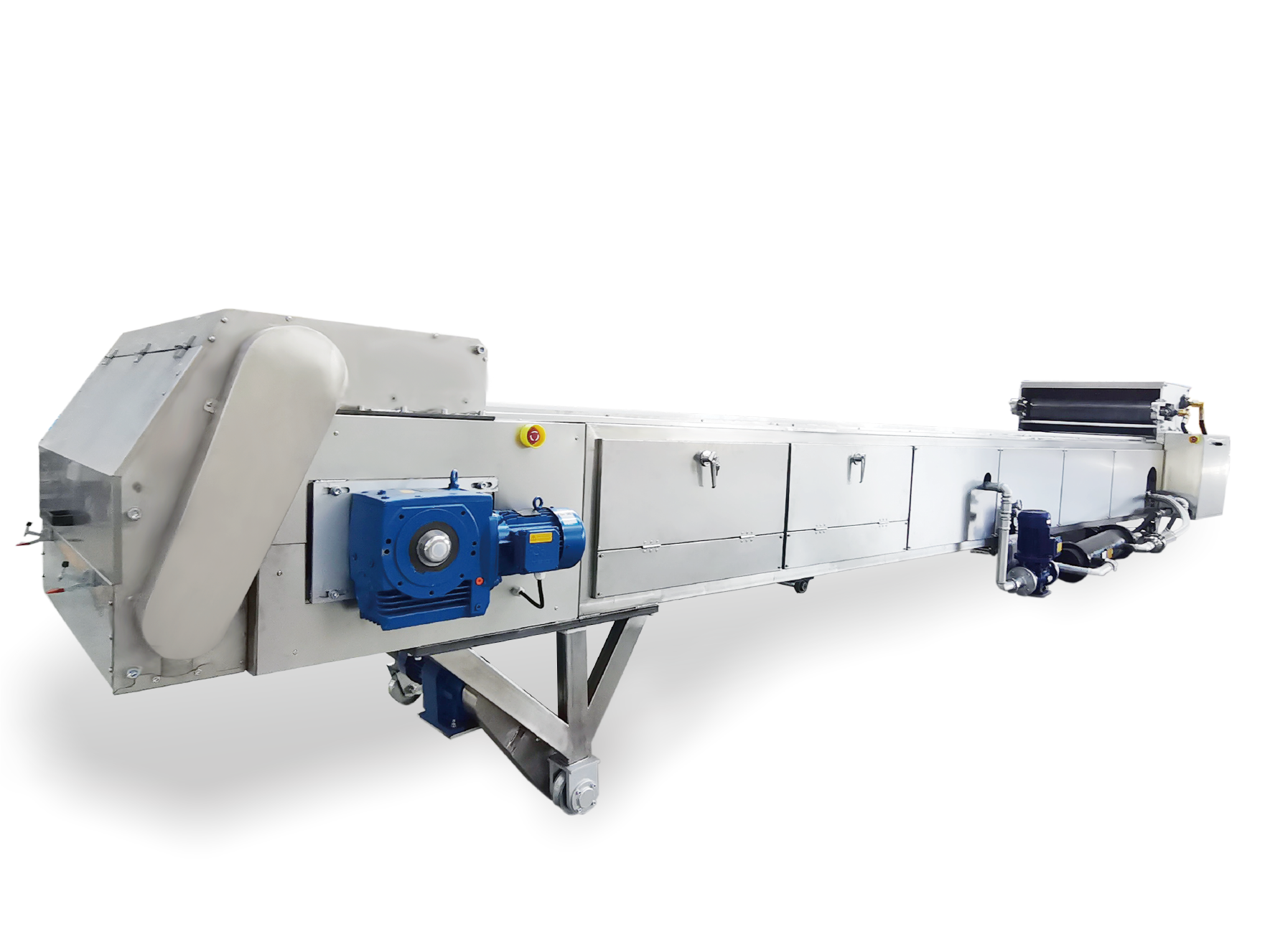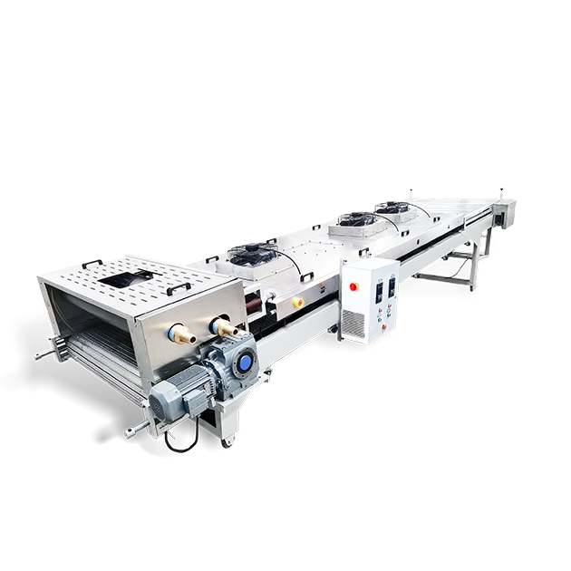 YPJ系列風冷鏈板式壓片破碎機YPJ系列不銹鋼鏈板壓片機由冷卻壓輥、不銹鋼節片輸送帶、破碎和風冷系統組成。擠出機擠出的熱熔融狀物料經冷卻壓輥壓成1-2mm帶狀,在不銹鋼節片輸送帶上風冷至常溫,破碎成片狀物料排出。可選配有空氣過濾,冷熱交換系統。