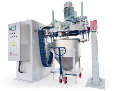 LCM系列翻轉式自動混合機LCM系列混合機采用可移動式料斗,適用于各種粉末及粒狀材料的混合攪拌。裝有待混合原料的料斗推到工位后,自動控制系統將其提升,與攪拌頭安全鎖定。料斗與攪拌頭一起翻轉180度