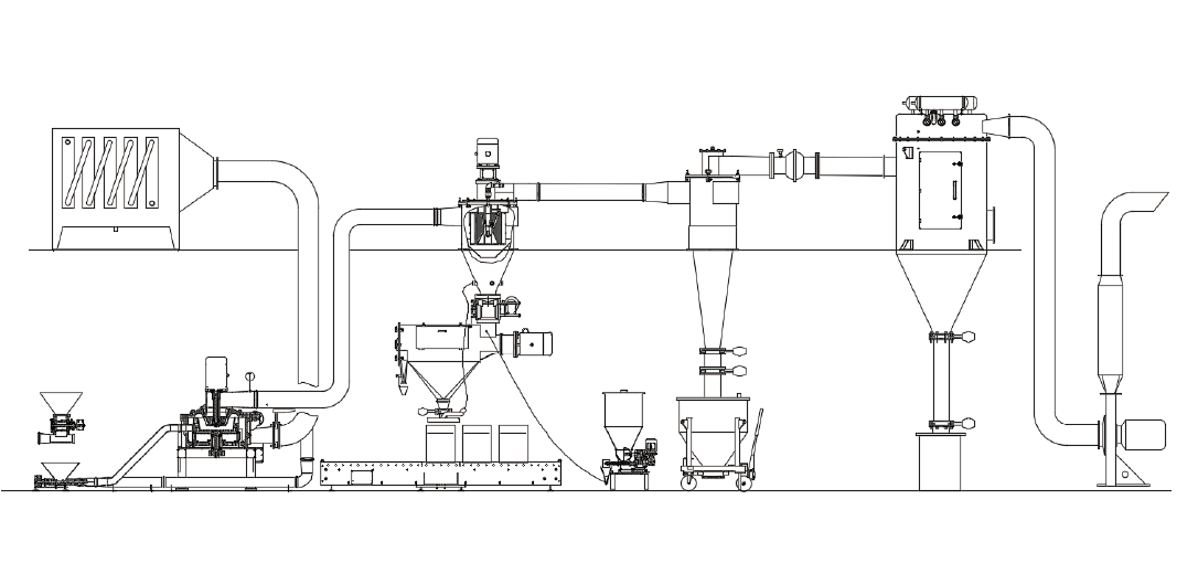 ACM系列微粉粉碎系統由空氣分級磨、旋風分離器、旋轉篩或者振動篩、超細粉集塵箱和高壓風機構成。具有高速破碎、空氣分級、旋風分離、篩分和超細粉收集等功能。通過調整運行參數可以獲得理想的粒徑分布。ACM系列微粉粉碎系統也可以用于顏料、鈣粉、碳粉、藥品及食品的粉碎。